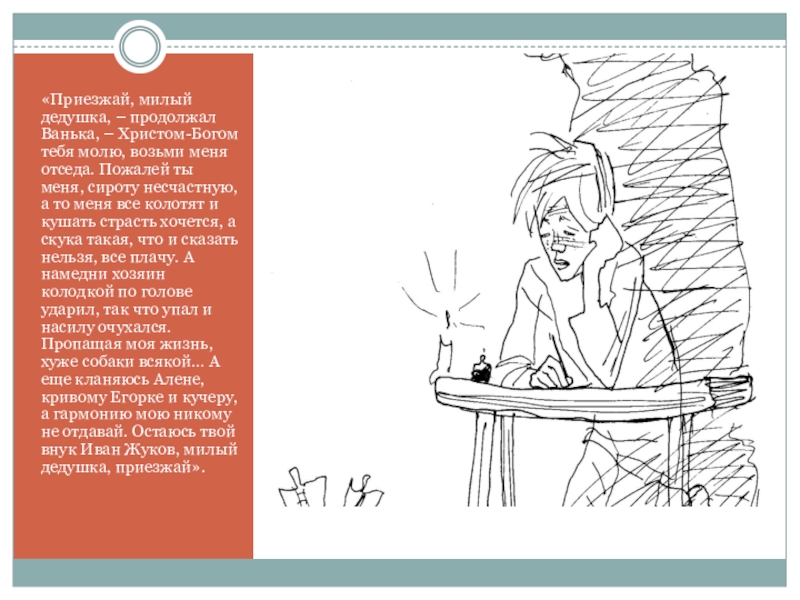 Слайд 9«Приезжай, милый дедушка, – продолжал Ванька, – Христом-Богом тебя молю, возьми