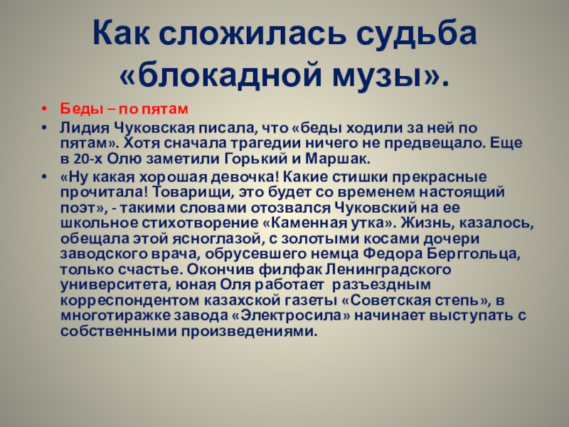 «Ну какая хорошая девочка! Какие стишки прекрасные прочитала! Товарищи, это будет со временем настоящий поэт», - такими словами отозвался Чуковский на ее школьное стихотворение «Каменная утка». Жизнь, казалось, обещала этой ясноглазой, с золотыми косами дочери заводского врача, обрусевшего немца Федора Берггольца, только счастье. Окончив филфак Ленинградского университета, юная Оля работает разъездным корреспондентом казахской газеты «Советская степь», в многотиражке завода «Электросила» начинает выступать с собственными произведениями.