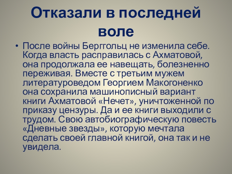 расправилась с Ахматовой, она продолжала ее навещать, болезненно переживая. Вместе с третьим мужем литературоведом Георгием Макогоненко она сохранила машинописный вариант книги Ахматовой «Нечет», уничтоженной по приказу цензуры. Да и ее книги выходили с трудом. Свою автобиографическую повесть «Дневные звезды», которую мечтала сделать своей главной книгой, она так и не увидела.