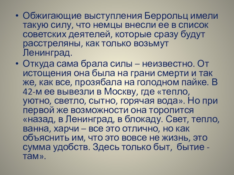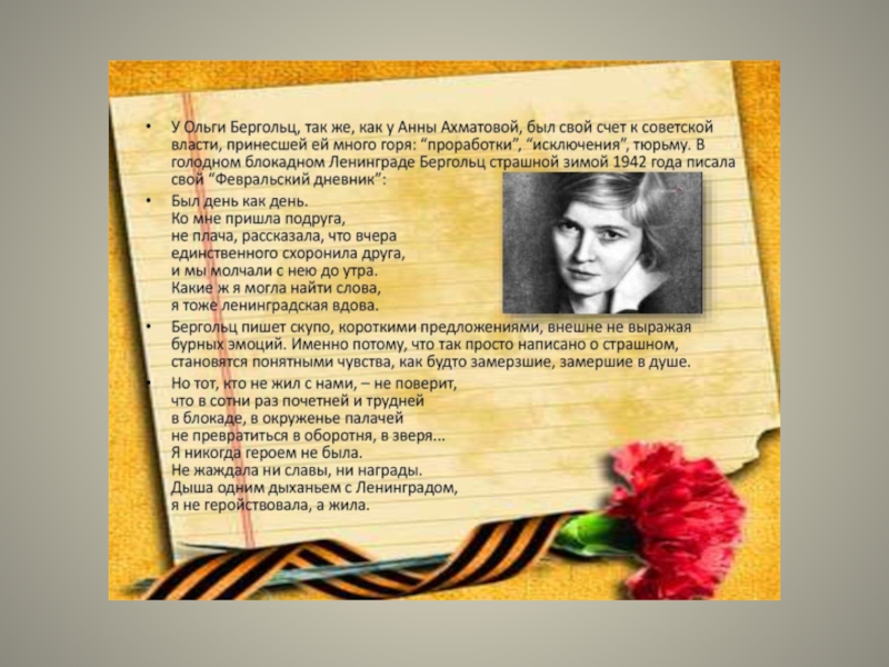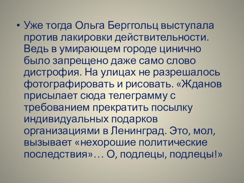 Слайд 27Уже тогда Ольга Берггольц выступала против лакировки действительности. Ведь в умирающем