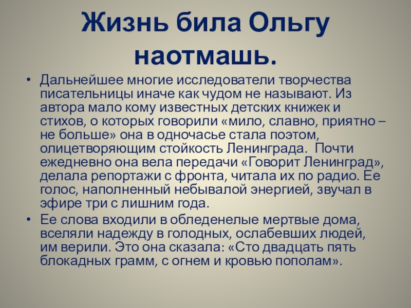 чудом не называют. Из автора мало кому известных детских книжек и стихов, о которых говорили «мило, славно, приятно – не больше» она в одночасье стала поэтом, олицетворяющим стойкость Ленинграда. Почти ежедневно она вела передачи «Говорит Ленинград», делала репортажи с фронта, читала их по радио. Ее голос, наполненный небывалой энергией, звучал в эфире три с лишним года.
