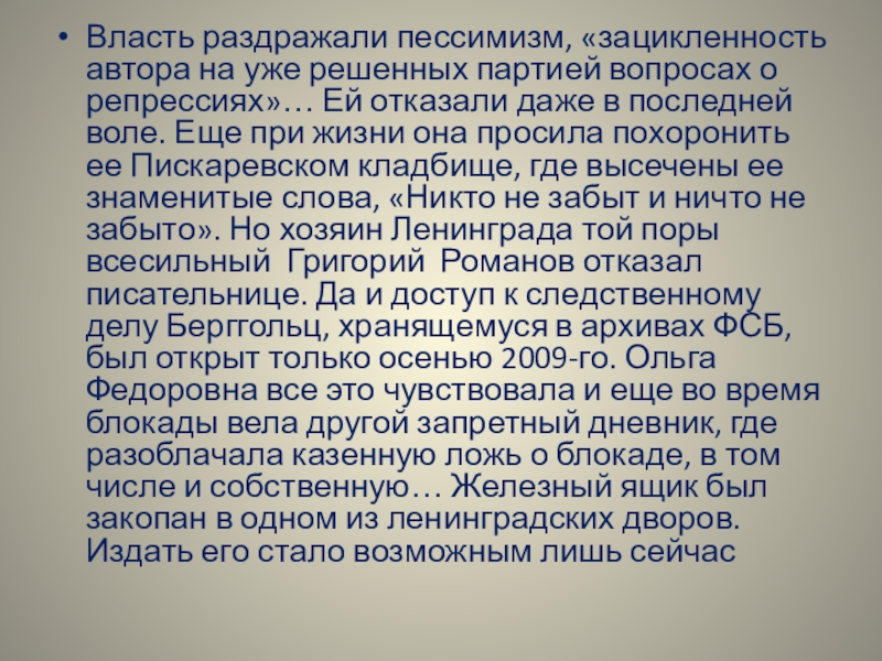 репрессиях»… Ей отказали даже в последней воле. Еще при жизни она просила похоронить ее Пискаревском кладбище, где высечены ее знаменитые слова, «Никто не забыт и ничто не забыто». Но хозяин Ленинграда той поры всесильный Григорий Романов отказал писательнице. Да и доступ к следственному делу Берггольц, хранящемуся в архивах ФСБ, был открыт только осенью 2009-го. Ольга Федоровна все это чувствовала и еще во время блокады вела другой запретный дневник, где разоблачала казенную ложь о блокаде, в том числе и собственную… Железный ящик был закопан в одном из ленинградских дворов. Издать его стало возможным лишь сейчас