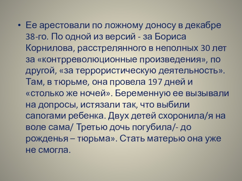 версий - за Бориса Корнилова, расстрелянного в неполных 30 лет за «контрреволюционные произведения», по другой, «за террористическую деятельность». Там, в тюрьме, она провела 197 дней и «столько же ночей». Беременную ее вызывали на допросы, истязали так, что выбили сапогами ребенка. Двух детей схоронила/я на воле сама/ Третью дочь погубила/- до рожденья – тюрьма». Стать матерью она уже не смогла.