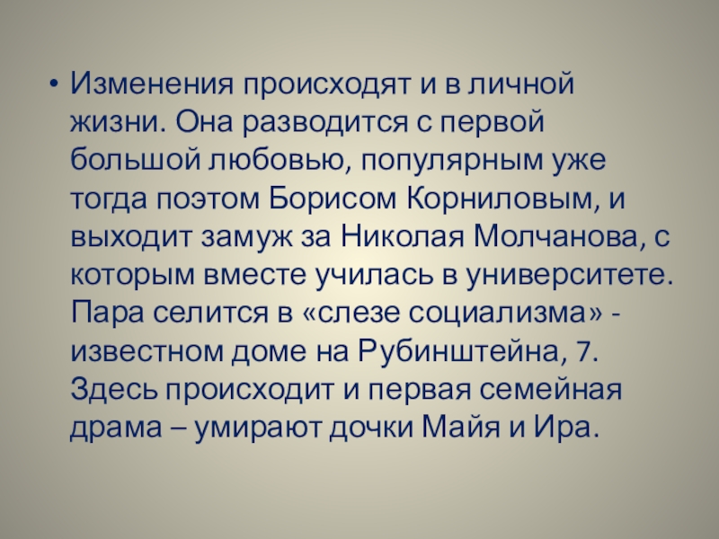 любовью, популярным уже тогда поэтом Борисом Корниловым, и выходит замуж за Николая Молчанова, с которым вместе училась в университете. Пара селится в «слезе социализма» - известном доме на Рубинштейна, 7. Здесь происходит и первая семейная драма – умирают дочки Майя и Ира.
