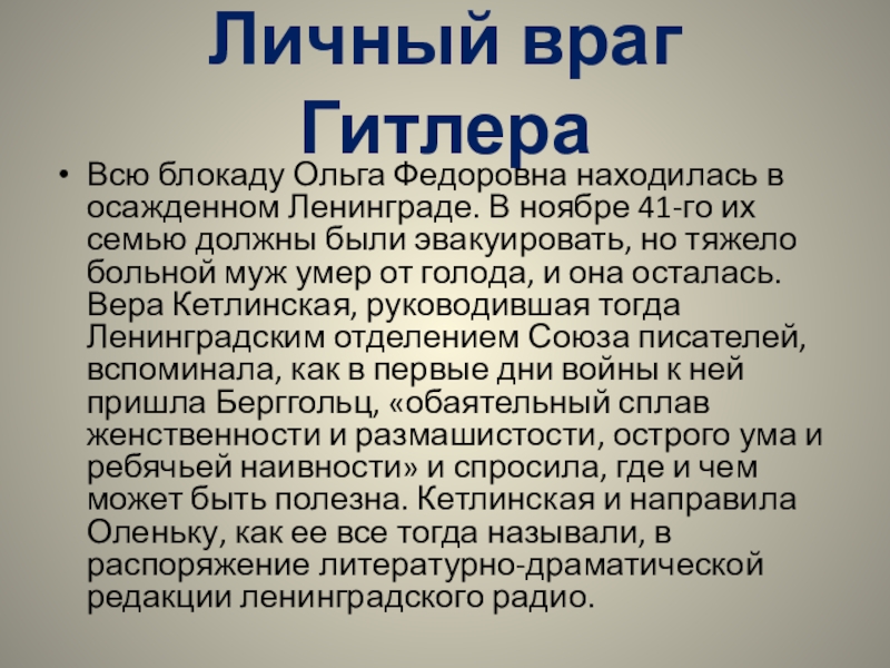 ноябре 41-го их семью должны были эвакуировать, но тяжело больной муж умер от голода, и она осталась. Вера Кетлинская, руководившая тогда Ленинградским отделением Союза писателей, вспоминала, как в первые дни войны к ней пришла Берггольц, «обаятельный сплав женственности и размашистости, острого ума и ребячьей наивности» и спросила, где и чем может быть полезна. Кетлинская и направила Оленьку, как ее все тогда называли, в распоряжение литературно-драматической редакции ленинградского радио.