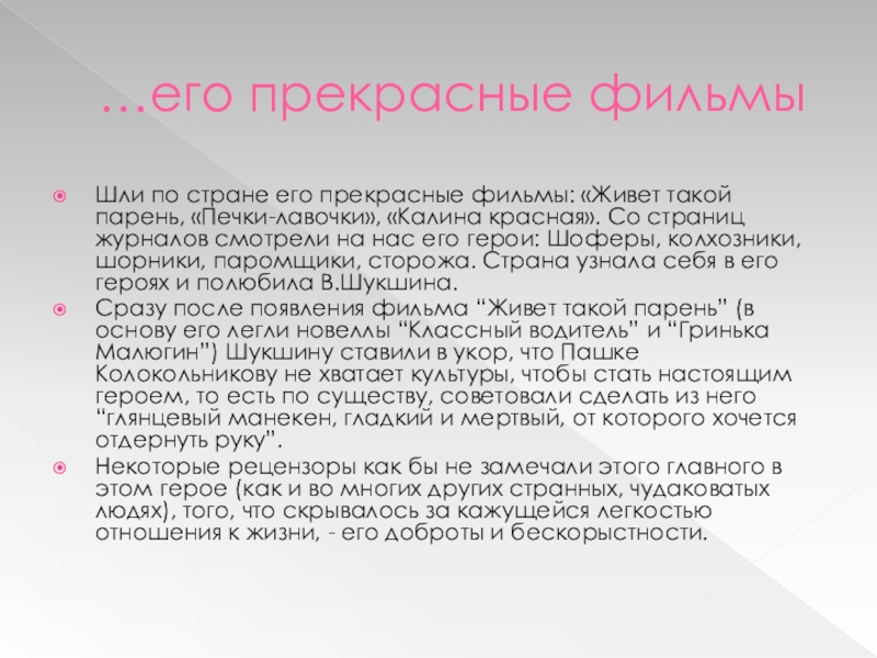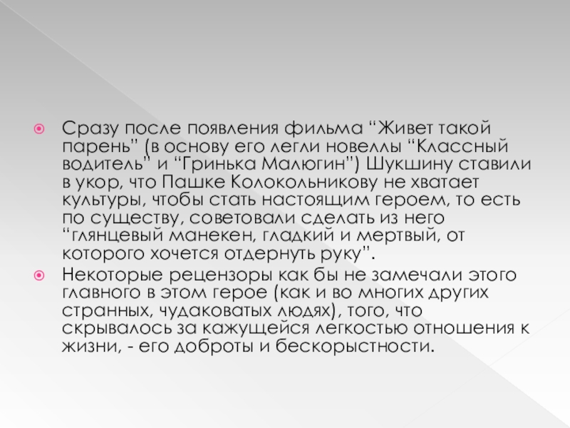 Сразу после появления фильма “Живет такой парень” (в основу его легли новеллы “Классный водитель” и “Гринька Малюгин”) Шукшину ставили в укор, что Пашке Колокольникову не хватает культуры, чтобы стать настоящим героем, то есть по существу, советовали сделать из него “глянцевый манекен, гладкий и мертвый, от которого хочется отдернуть руку”.