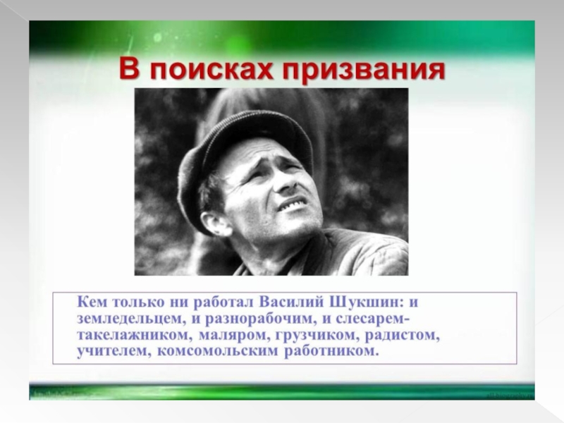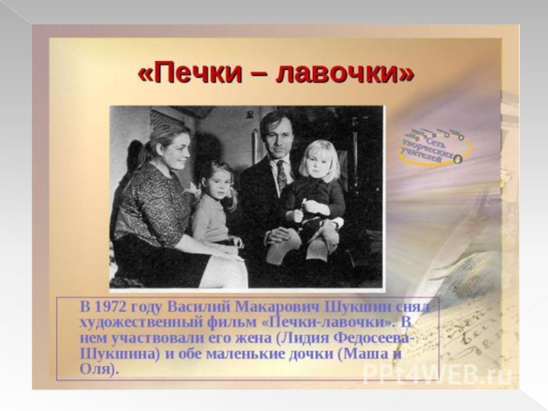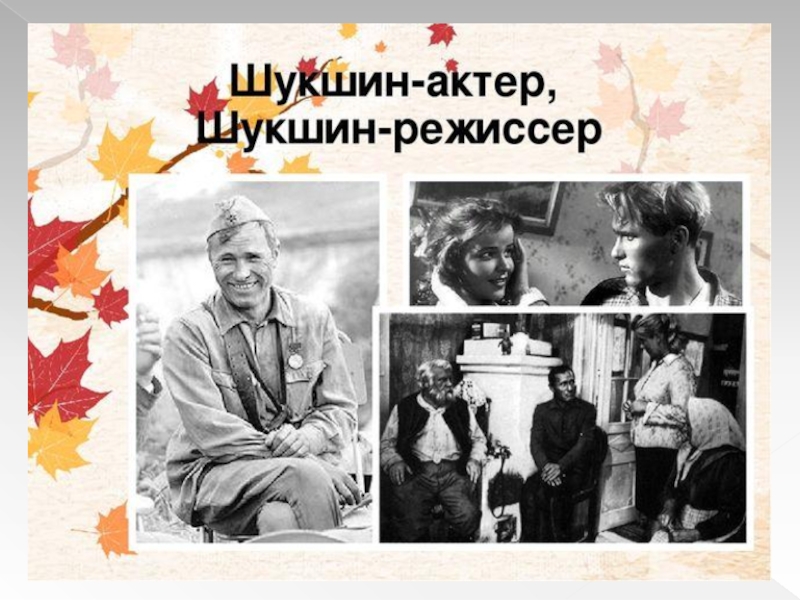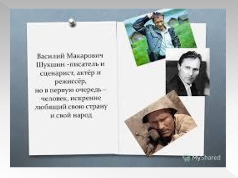 «Печки-лавочки», «Калина красная». Со страниц журналов смотрели на нас его герои: Шоферы, колхозники, шорники, паромщики, сторожа. Страна узнала себя в его героях и полюбила В.Шукшина.