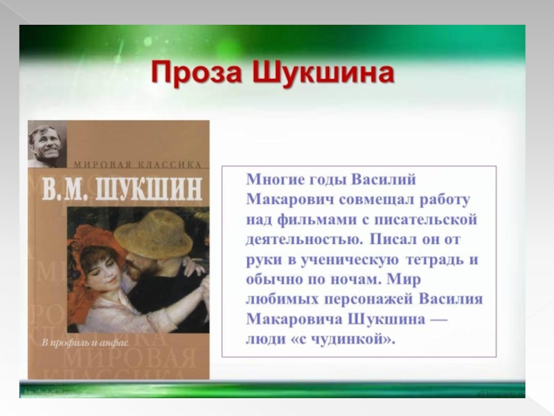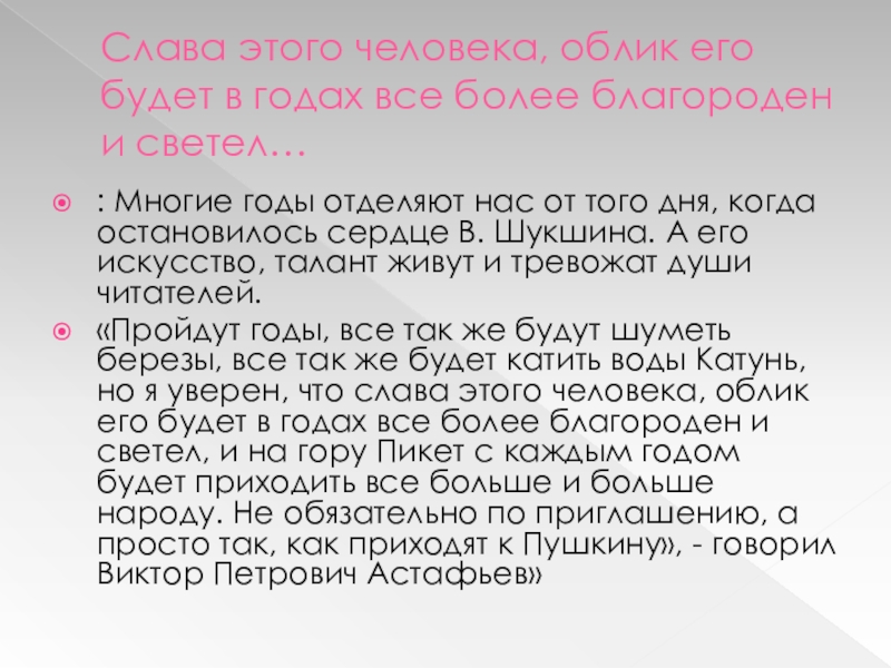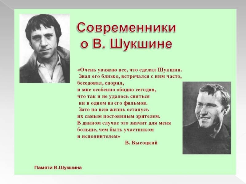 : Многие годы отделяют нас от того дня, когда остановилось сердце В. Шукшина. А его искусство, талант живут и тревожат души читателей.