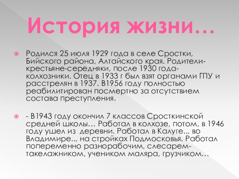 - В1943 году окончил 7 классов Сросткинской средней школы… Работал в колхозе, потом, в 1946 году ушел из деревни. Работал в Калуге.., во Владимире.., на стройках Подмосковья. Работал попеременно разнорабочим, слесарем-такелажником, учеником маляра, грузчиком…