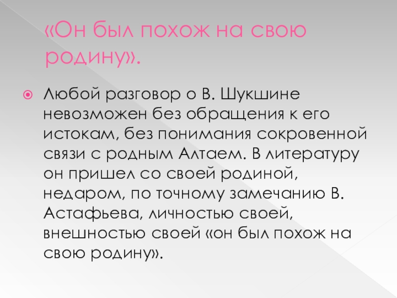 без обращения к его истокам, без понимания сокровенной связи с родным Алтаем. В литературу он пришел со своей родиной, недаром, по точному замечанию В. Астафьева, личностью своей, внешностью своей «он был похож на свою родину».