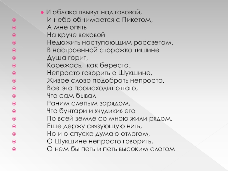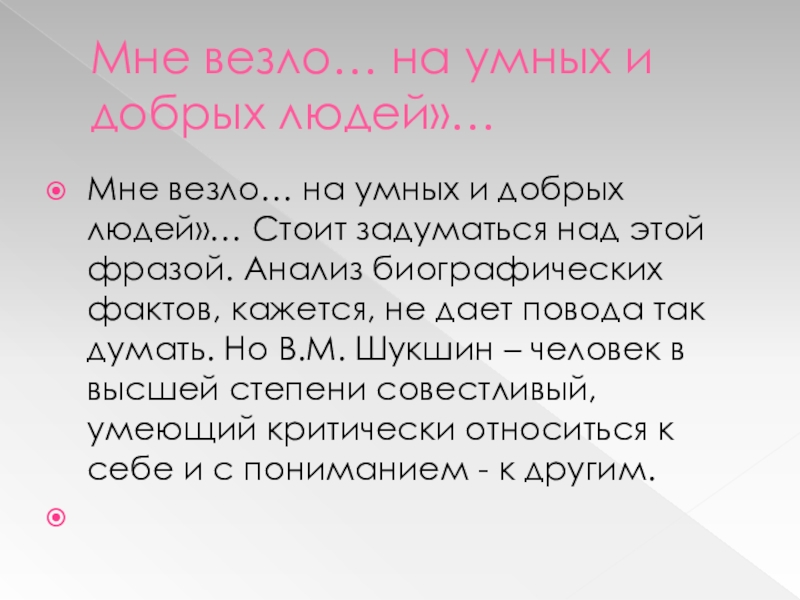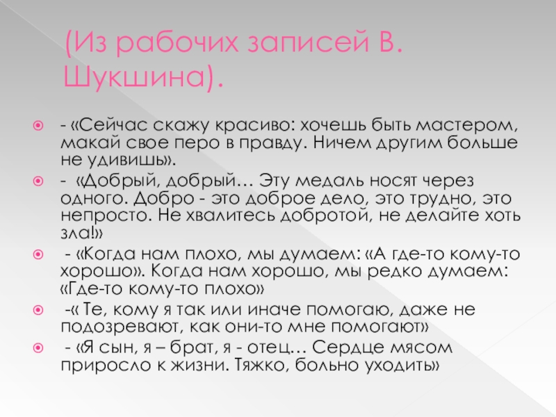 и добрых людей»… Стоит задуматься над этой фразой. Анализ биографических фактов, кажется, не дает повода так думать. Но В.М. Шукшин – человек в высшей степени совестливый, умеющий критически относиться к себе и с пониманием - к другим.