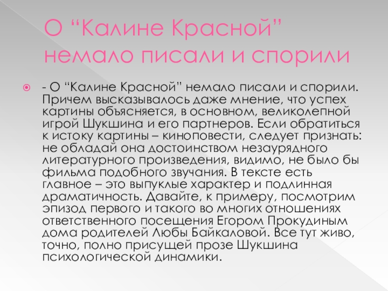писали и спорили. Причем высказывалось даже мнение, что успех картины объясняется, в основном, великолепной игрой Шукшина и его партнеров. Если обратиться к истоку картины – киноповести, следует признать: не обладай она достоинством незаурядного литературного произведения, видимо, не было бы фильма подобного звучания. В тексте есть главное – это выпуклые характер и подлинная драматичность. Давайте, к примеру, посмотрим эпизод первого и такого во многих отношениях ответственного посещения Егором Прокудиным дома родителей Любы Байкаловой. Все тут живо, точно, полно присущей прозе Шукшина психологической динамики.