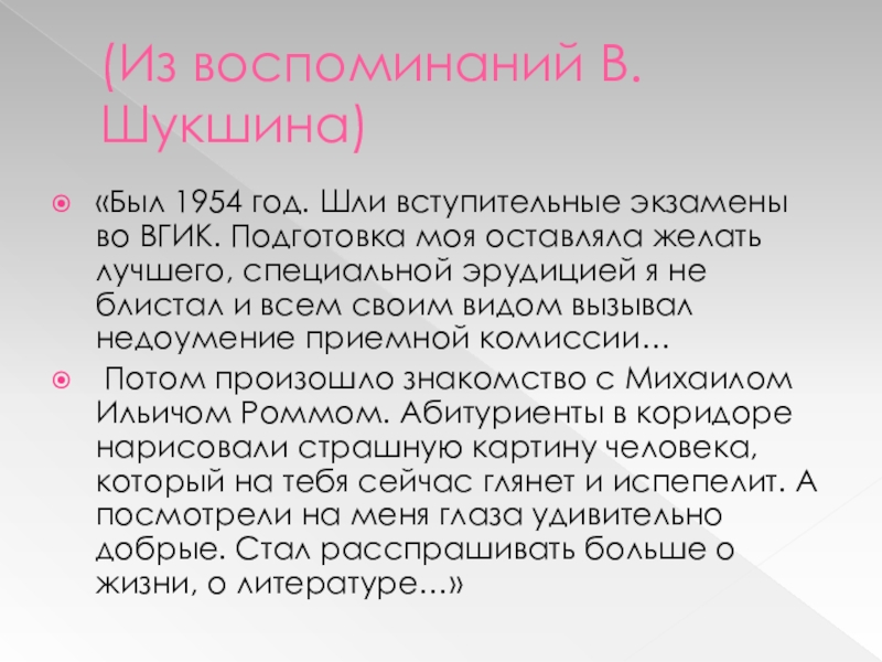 Потом произошло знакомство с Михаилом Ильичом Роммом. Абитуриенты в коридоре нарисовали страшную картину человека, который на тебя сейчас глянет и испепелит. А посмотрели на меня глаза удивительно добрые. Стал расспрашивать больше о жизни, о литературе…»