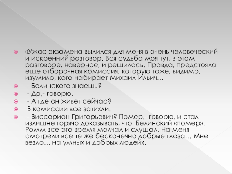 Слайд 18«Ужас экзамена вылился для меня в очень человеческий и искренний разговор.
