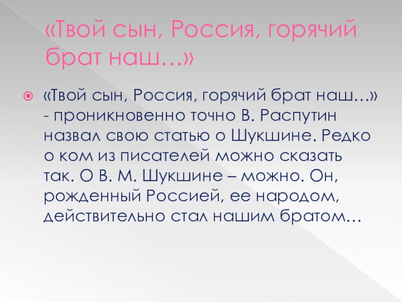 проникновенно точно В. Распутин назвал свою статью о Шукшине. Редко о ком из писателей можно сказать так. О В. М. Шукшине – можно. Он, рожденный Россией, ее народом, действительно стал нашим братом…