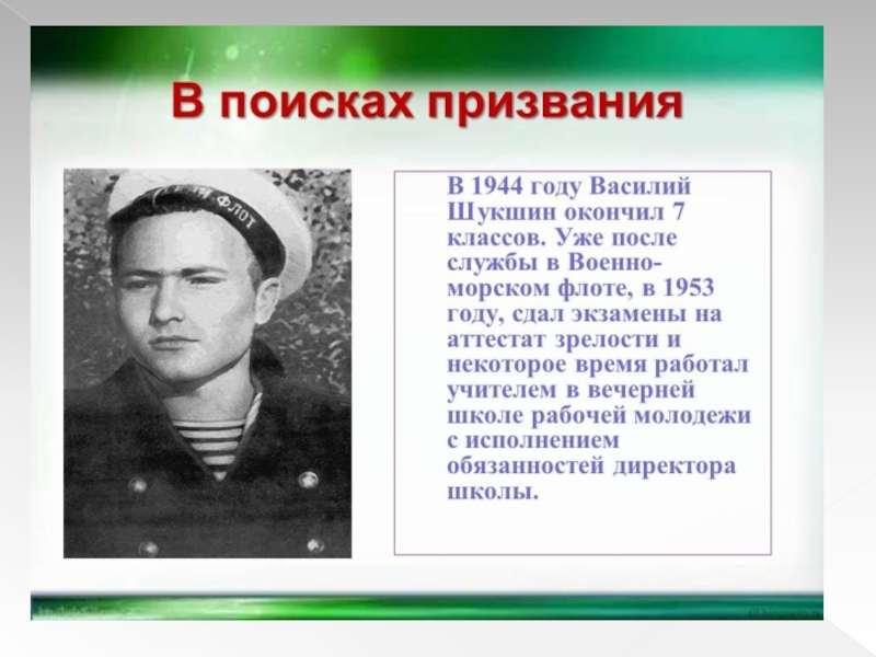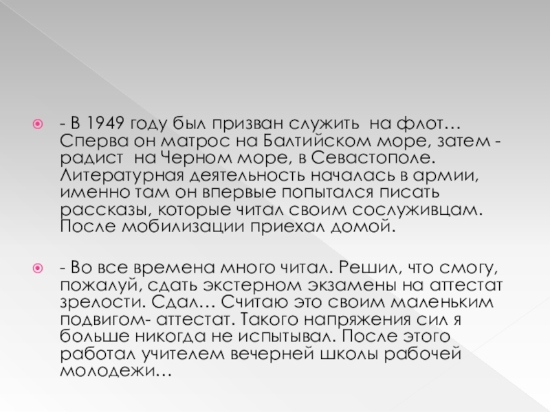 Слайд 14- В 1949 году был призван служить на флот… Сперва он
