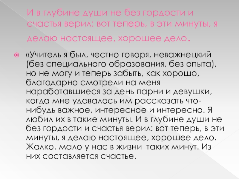 «Учитель я был, честно говоря, неважнецкий (без специального образования, без опыта), но не могу и теперь забыть, как хорошо, благодарно смотрели на меня наработавшиеся за день парни и девушки, когда мне удавалось им рассказать что-нибудь важное, интересное и интересно. Я любил их в такие минуты. И в глубине души не без гордости и счастья верил: вот теперь, в эти минуты, я делаю настоящее, хорошее дело. Жалко, мало у нас в жизни таких минут. Из них составляется счастье.
