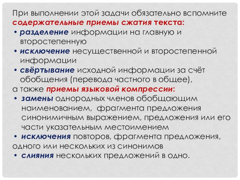 Слайд 14При выполнении этой задачи обязательно вспомните содержательные приемы сжатия текста:
