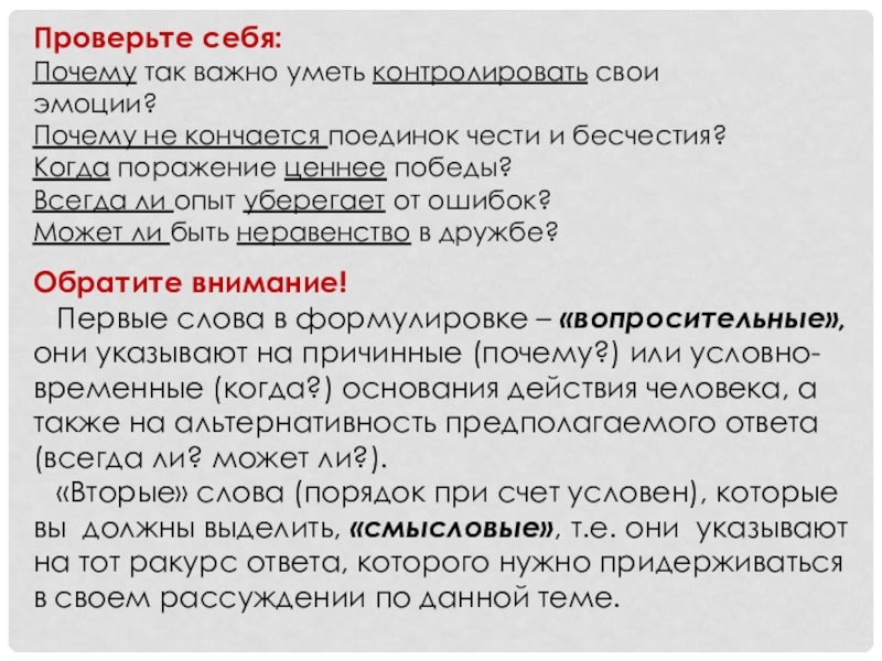 Первые слова в формулировке – «вопросительные», они указывают на причинные (почему?) или условно-временные (когда?) основания действия человека, а также на альтернативность предполагаемого ответа (всегда ли? может ли?).
