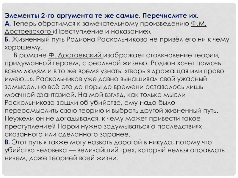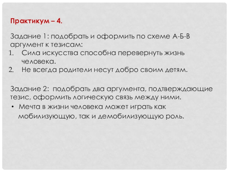 Задание 1: подобрать и оформить по схеме А-Б-В аргумент