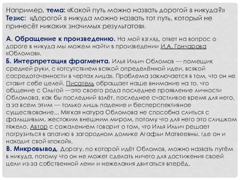 В. Микровывод. Дорогу, по которой идёт Обломов, можно назвать путём в никуда, потому что он не может сделать ничего для достижения своей цели из-за собственной лени и нежелания двигаться вперёд.