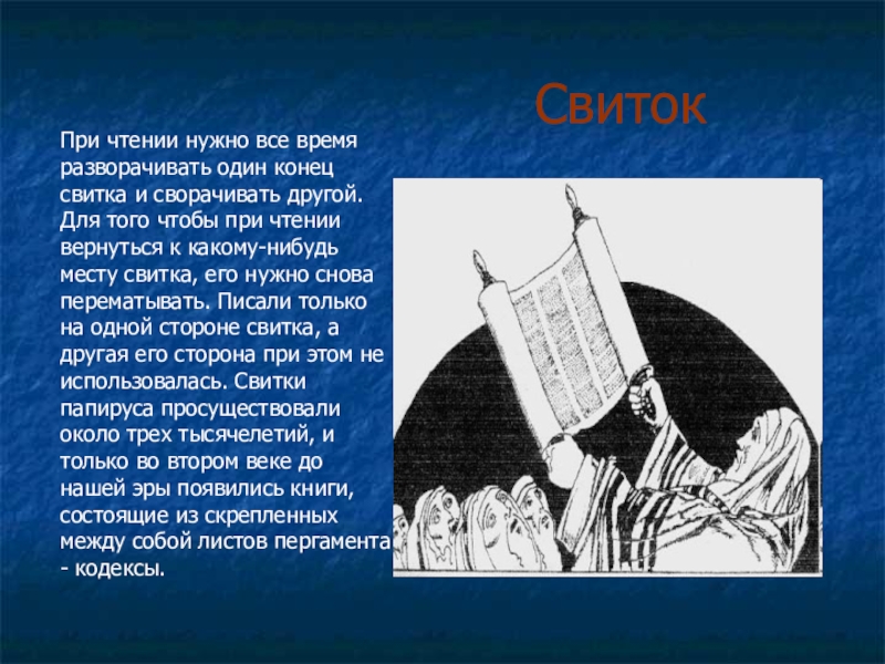 другой. Для того чтобы при чтении вернуться к какому-нибудь месту свитка, его нужно снова перематывать. Писали только на одной стороне свитка, а другая его сторона при этом не использовалась. Свитки папируса просуществовали около трех тысячелетий, и только во втором веке до нашей эры появились книги, состоящие из скрепленных между собой листов пергамента - кодексы.