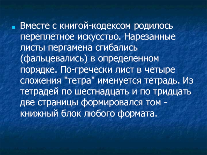 Слайд 16Вместе с книгой-кодексом родилось переплетное искусство. Нарезанные листы пергамена сгибались (фальцевались)