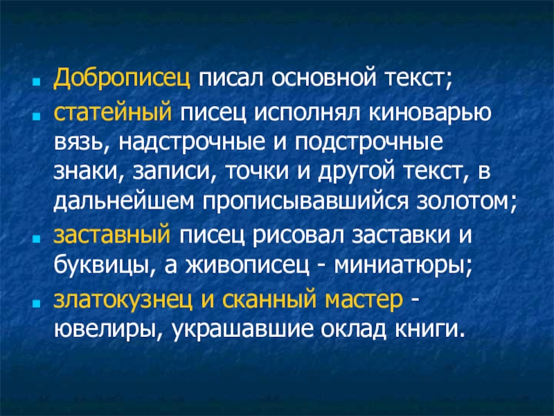 заставный писец рисовал заставки и буквицы, а живописец - миниатюры;