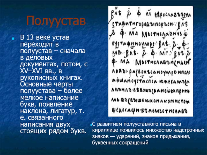 документах, потом, с XV–XVI вв., в рукописных книгах. Основные черты полуустава – более мелкое написание букв, появление наклона, лигатур, т.е. связанного написания двух стоящих рядом букв.