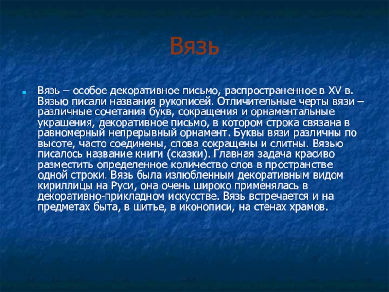 названия рукописей. Отличительные черты вязи – различные сочетания букв, сокращения и орнаментальные украшения, декоративное письмо, в котором строка связана в равномерный непрерывный орнамент. Буквы вязи различны по высоте, часто соединены, слова сокращены и слитны. Вязью писалось название книги (сказки). Главная задача красиво разместить определенное количество слов в пространстве одной строки. Вязь была излюбленным декоративным видом кириллицы на Руси, она очень широко применялась в декоративно-прикладном искусстве. Вязь встречается и на предметах быта, в шитье, в иконописи, на стенах храмов.