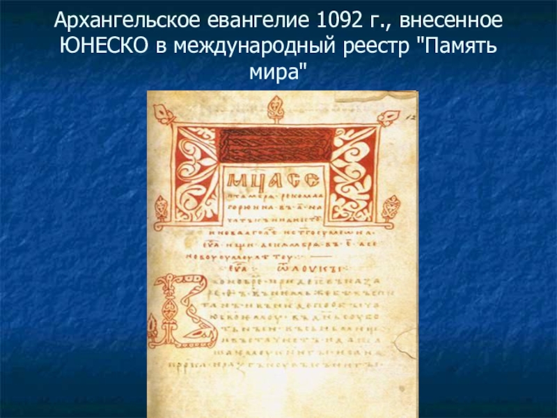 Слайд 22Архангельское евангелие 1092 г., внесенное ЮНЕСКО в международный реестр "Память мира"