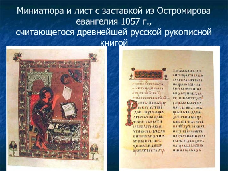 Слайд 20Миниатюра и лист с заставкой из Остромирова евангелия 1057 г.,