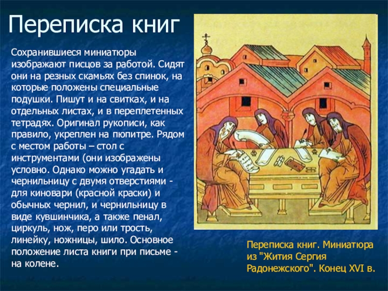 миниатюры изображают писцов за работой. Сидят они на резных скамьях без спинок, на которые положены специальные подушки. Пишут и на свитках, и на отдельных листах, и в переплетенных тетрадях. Оригинал рукописи, как правило, укреплен на пюпитре. Рядом с местом работы – стол с инструментами (они изображены условно. Однако можно угадать и чернильницу с двумя отверстиями - для киновари (красной краски) и обычных чернил, и чернильницу в виде кувшинчика, а также пенал, циркуль, нож, перо или трость, линейку, ножницы, шило. Основное положение листа книги при письме - на колене.