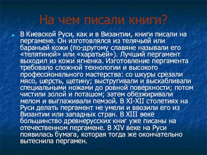 писали на пергамене. Он изготовлялся из телячьей или бараньей кожи (по-другому славяне называли его «телятиной» или «харатьей»). Лучший пергамент выходил из кожи ягненка. Изготовление пергамента требовало сложной технологии и высокого профессионального мастерства: со шкуры срезали мясо, шерсть, щетину; выстругивали и выскабливали специальными ножами до ровной поверхности; потом чистили золой и поташом; затем обезжиривали мелом и выглаживали пемзой. В XI-XII столетиях на Руси делать пергамент не умели и ввозили его из Византии или западных стран. В XIII веке большинство древнерусских книг уже писаны на отечественном пергамене. В XIV веке на Руси появилась бумага, которая тогда же окончательно вытеснила пергамен.