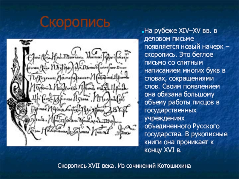 письме появляется новый начерк – скоропись. Это беглое письмо со слитным написанием многих букв в словах, сокращениями слов. Своим появлением она обязана большому объему работы писцов в государственных учреждениях объединенного Русского государства. В рукописные книги она проникает к концу XVI в.