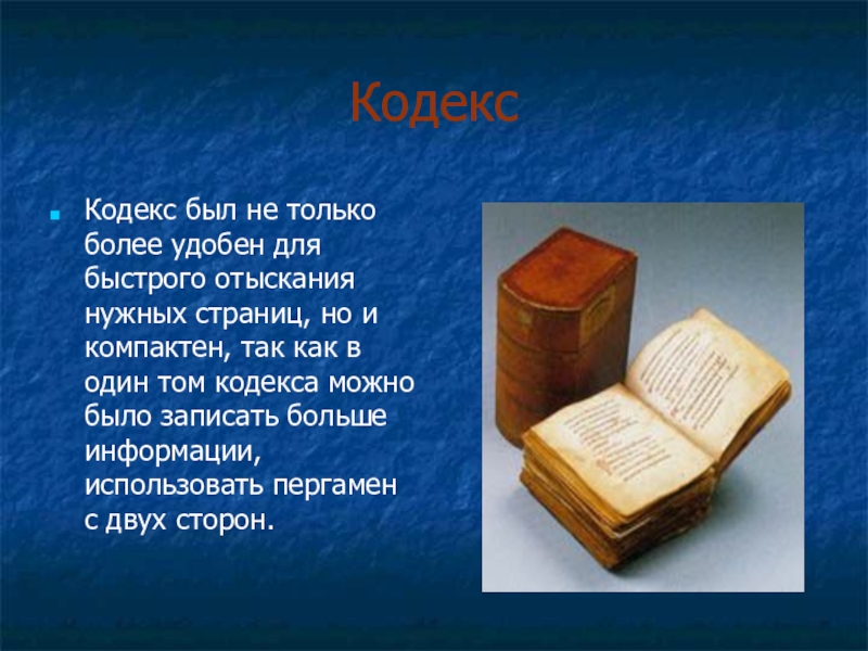 но и компактен, так как в один том кодекса можно было записать больше информации, использовать пергамен с двух сторон.
