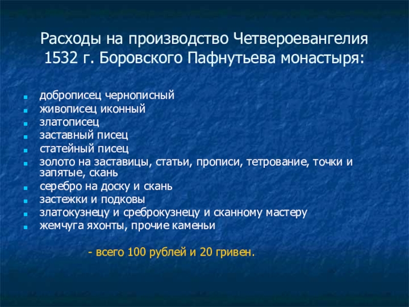 Слайд 7Расходы на производство Четвероевангелия 1532 г. Боровского Пафнутьева монастыря: