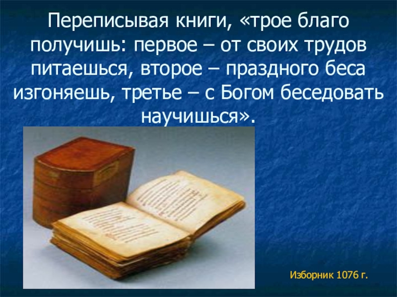 Слайд 3Переписывая книги, «трое благо получишь: первое – от своих трудов питаешься,