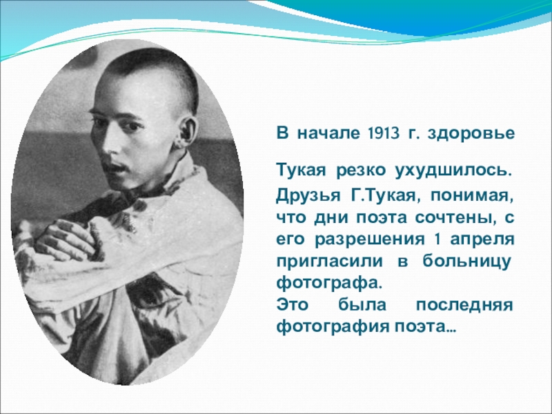 Слайд 16В начале 1913 г. здоровье Тукая резко ухудшилось. Друзья Г.Тукая, понимая,