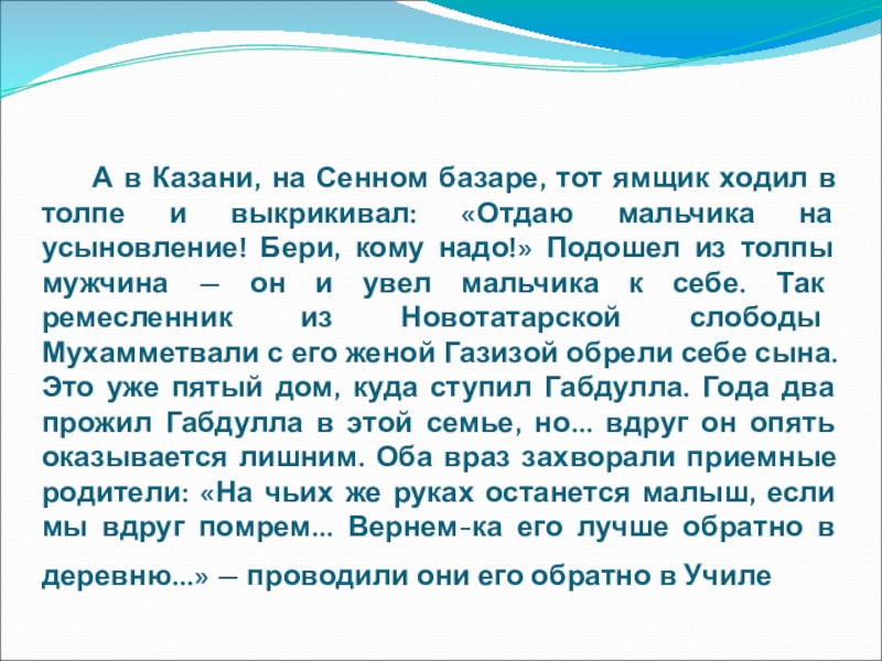 ходил в толпе и выкрикивал: «Отдаю мальчика на усыновление! Бери, кому надо!» Подошел из толпы мужчина — он и увел мальчика к себе. Так ремесленник из Новотатарской слободы Мухамметвали с его женой Газизой обрели себе сына. Это уже пятый дом, куда ступил Габдулла. Года два прожил Габдулла в этой семье, но... вдруг он опять оказывается лишним. Оба враз захворали приемные родители: «На чьих же руках останется малыш, если мы вдруг помрем... Вернем-ка его лучше обратно в деревню...» — проводили они его обратно в Училе