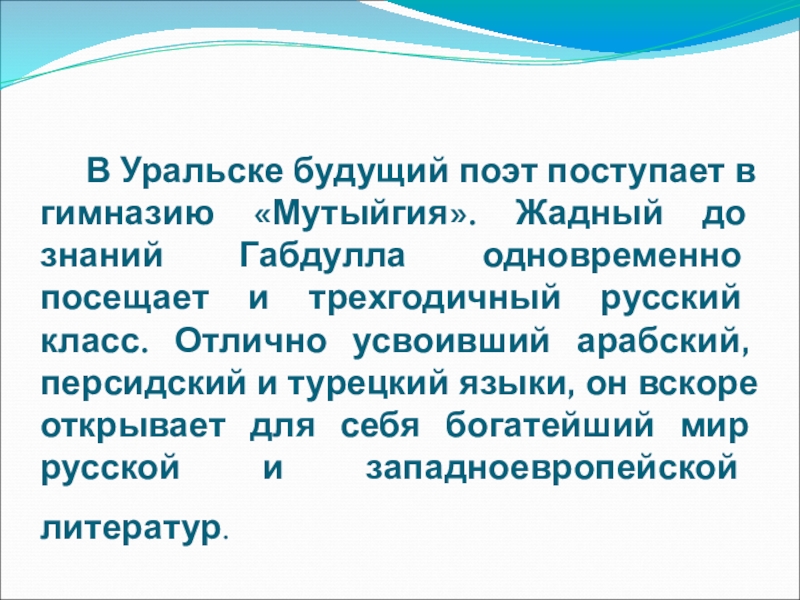 Слайд 11 В Уральске будущий поэт поступает в гимназию «Мутыйгия».