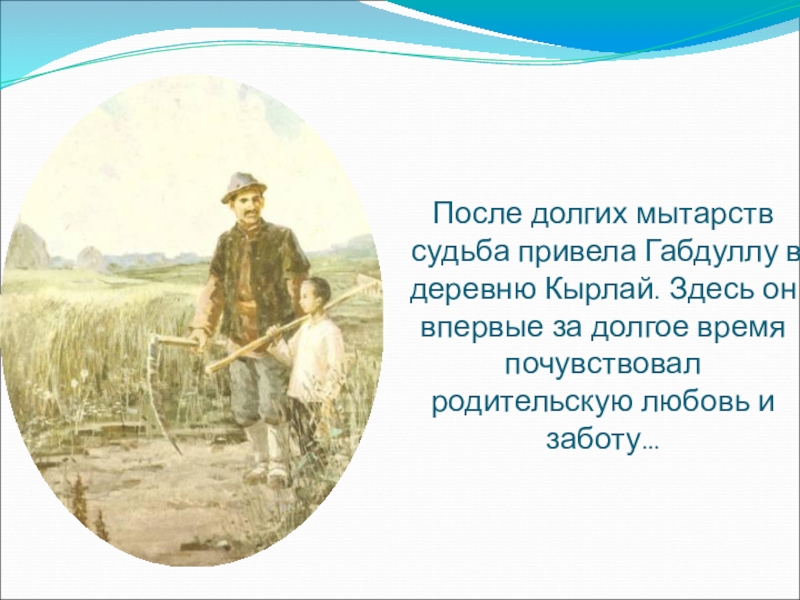 Слайд 8После долгих мытарств судьба привела Габдуллу в деревню Кырлай. Здесь он
