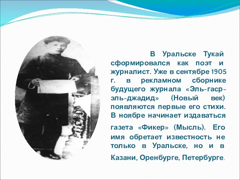 Слайд 13 В Уральске Тукай сформировался как поэт и журналист.