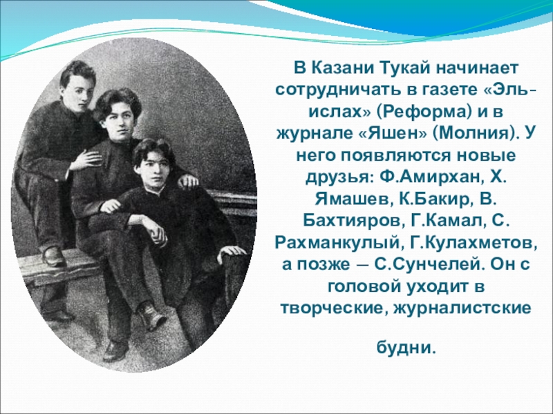 журнале «Яшен» (Молния). У него появляются новые друзья: Ф.Амирхан, Х.Ямашев, К.Бакир, В.Бахтияров, Г.Камал, С.Рахманкулый, Г.Кулахметов, а позже — С.Сунчелей. Он с головой уходит в творческие, журналистские будни.