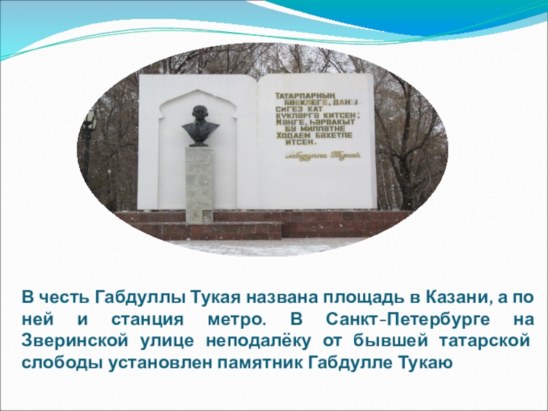 и станция метро. В Санкт-Петербурге на Зверинской улице неподалёку от бывшей татарской слободы установлен памятник Габдулле Тукаю