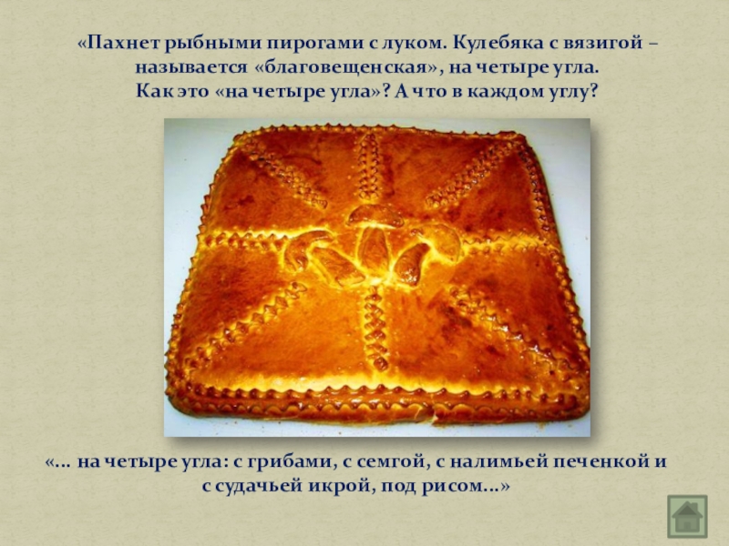«... на четыре угла: с грибами, с семгой, с налимьей печенкой и с судачьей икрой, под рисом...»