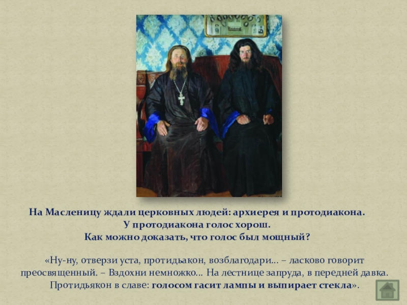 «Ну-ну, отверзи уста, протидьакон, возблагодари... – ласково говорит преосвященный. – Вздохни немножко... На лестнице запруда, в передней давка. Протидьякон в славе: голосом гасит лампы и выпирает стекла».