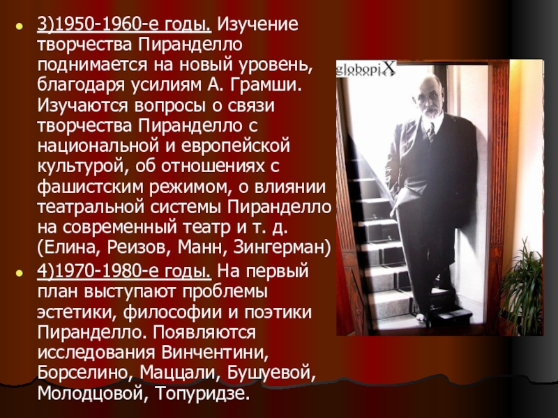 Слайд 143)1950-1960-е годы. Изучение творчества Пиранделло поднимается на новый уровень, благодаря усилиям