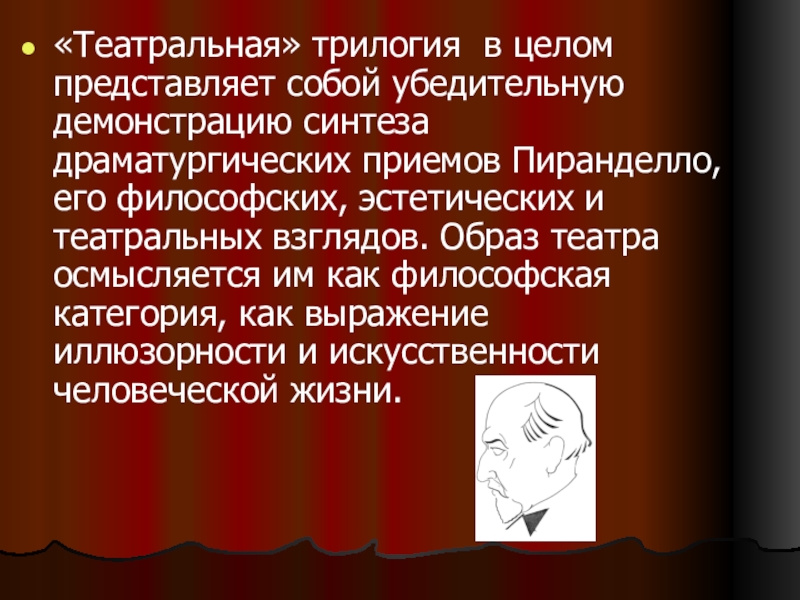 Слайд 24«Театральная» трилогия в целом представляет собой убедительную демонстрацию синтеза драматургических приемов