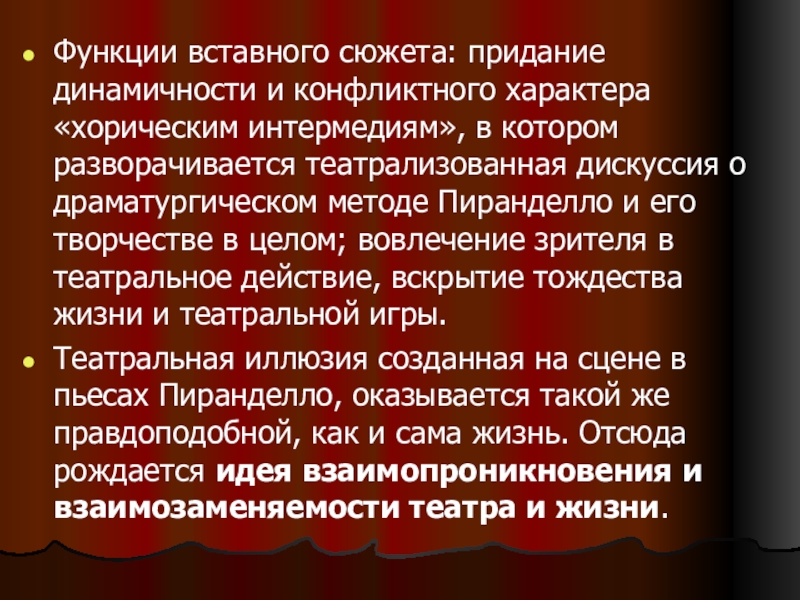 Театральная иллюзия созданная на сцене в пьесах Пиранделло, оказывается такой же правдоподобной, как и сама жизнь. Отсюда рождается идея взаимопроникновения и взаимозаменяемости театра и жизни.